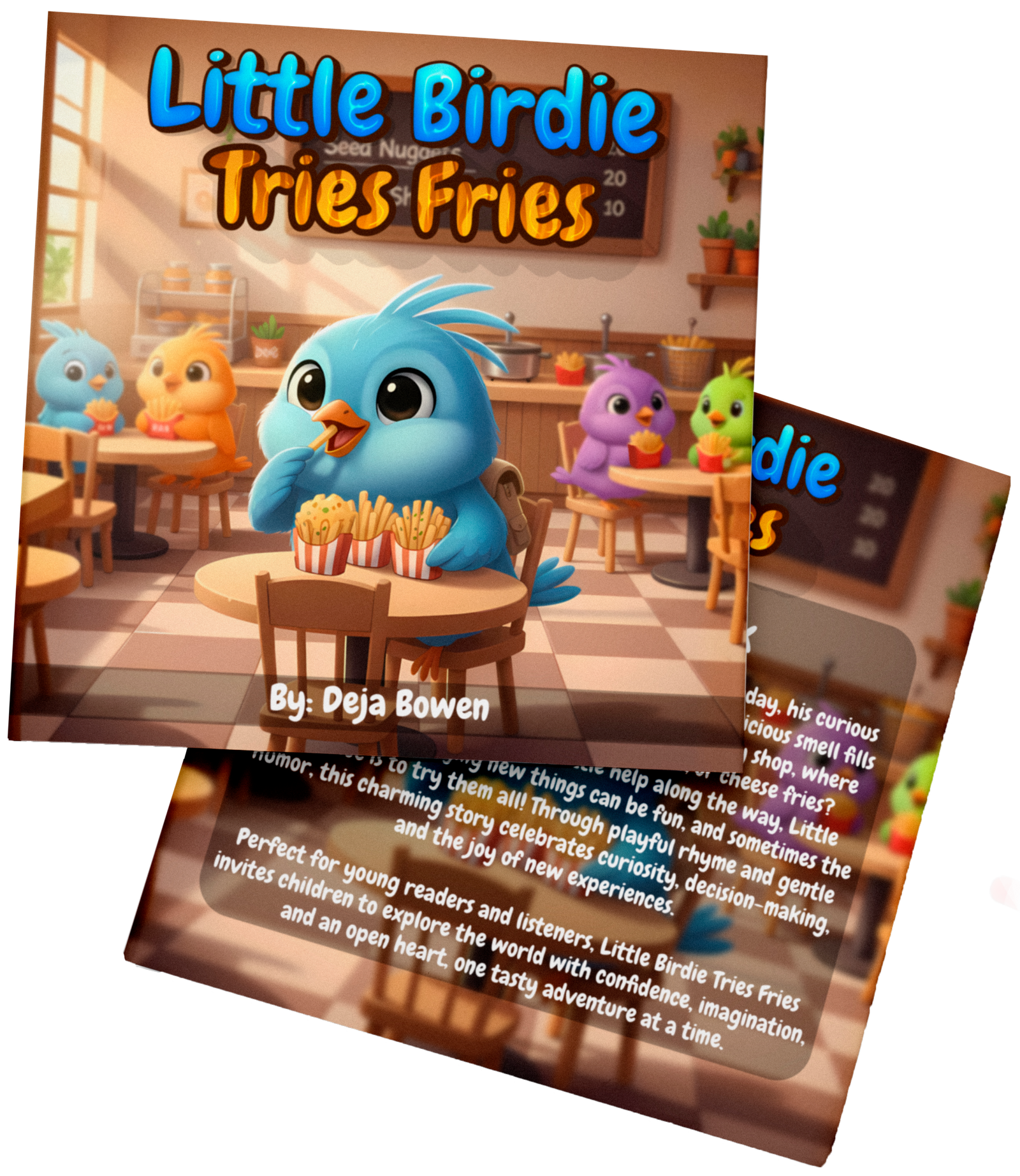 In this charming tale, Little Birdie’s curiosity leads him to a fry shop where he faces a delightful dilemma: choosing a flavor. The simple, rhythmic text guides young readers through his decision to try all three options—plain, garlic, and cheese—celebrating the joy of exploration and new experiences. Deja Bowen weaves themes of curiosity, problem-solving, and happiness into an accessible narrative.